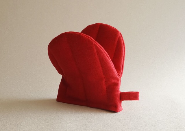 着脱しやすいコンパクトなミトン。 外側はリネン素材で中には断熱のための革と綿が入っています。熱い鍋やオーブン料理を出すときに便利です。 (フック付)