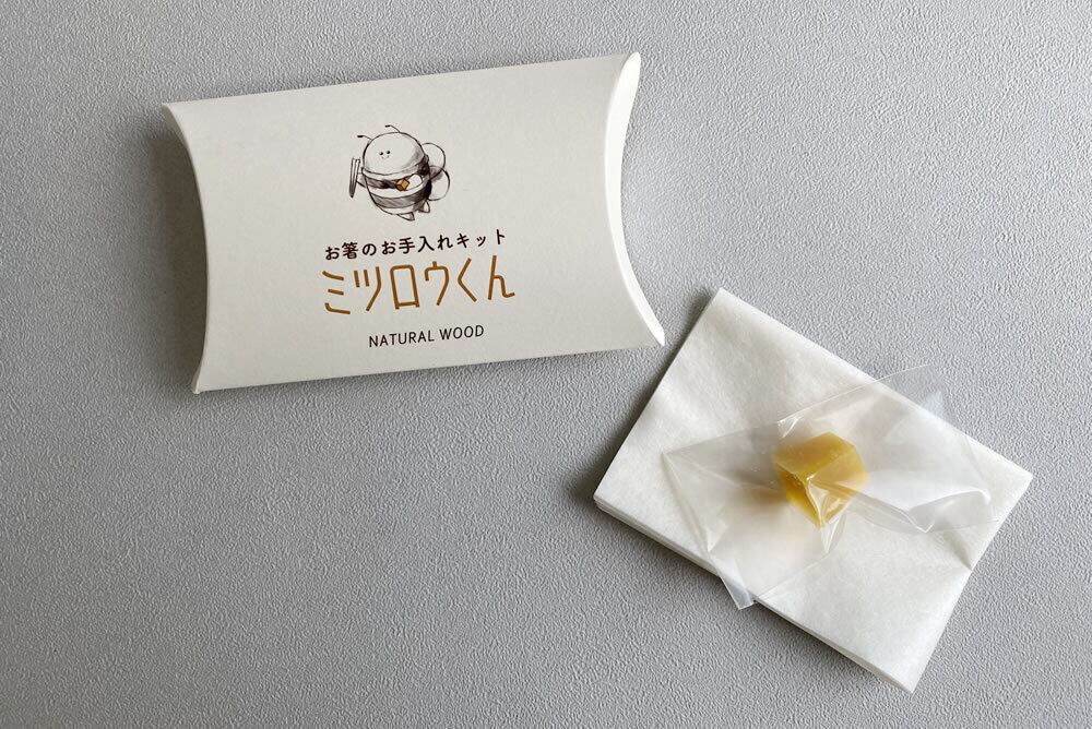 無塗装のお箸のお手入れにお使いいただけるキットです。 使いはじめはミツロウが塗られているのでツルツルした肌ざわりで、水分を程よく弾きます。 使用するにつれ、表面がパサついてきた時に、このミツロウを塗りこむと撥水性が復活します。
