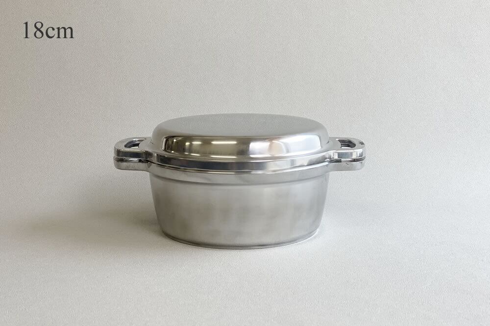 1953 年に広島で生まれた「無水鍋?」の復刻版モデル。 発売以来の機能と基本デザインを守りながら、現代のライフスタイルにあわせアレンジされています。 本体・フタとも、熱伝導性がよく耐久性に優れた厚手アルミニウム鋳物製で、 無水調理はもちろん、1鍋で8通りの調理法が楽しめる多機能鍋です。(IH対応)