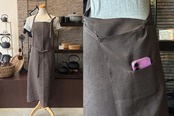薄地の高級リネンで軽やかに着用いただけるロングタイプのフルエプロン。 深い黒でも上質な亜麻の自然な光沢とやわらかさのおかげです。 右後ろに携帯が入る小さなポケット付き。ユニセックスで着用いただけます。