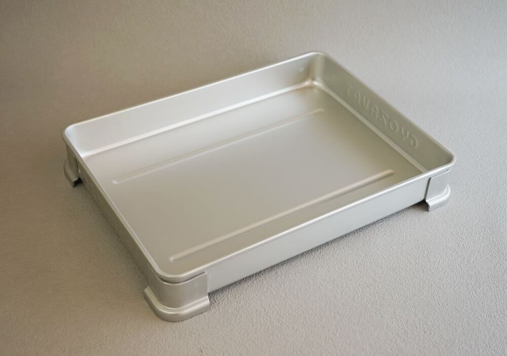プロ仕様で使われている軽くて扱いやすいアルミ製バット。本来は業務用で餃子の保存に使われていますが、家庭用では料理の下ごしらえにもおすすめ。 スタッキングできる足付きで、別売りのフタもありますのでぜひご一緒に。 「GYOZAVAT」のロゴもクール。アウトドアでカトラリー類を入れたり、文具類の整頓にも。使い道色々!
