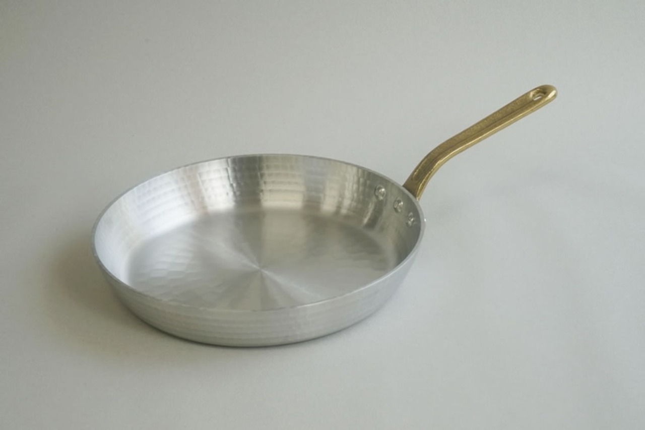 パスタなどソースと絡めたり、少量油で揚げたり、焼いたものをそのまま煮込むなどはお得意です。 今回、笹部さんが当店にすすめてくれたフライパンが、アルミの厚手のシリーズ・プロキングのフライパンです。 昔からある道具なのですが、陰に隠れてしまっている印象もございます。 正式名は、パエリアパン片手となりますが、パエリアだけでなく、フライパンとしてもご利用頂けます。 底面積が広くなり、ハンドルも短く真鍮製ですので、オーブンにも利用できて、そのまま卓上でお皿代わりにもなります。